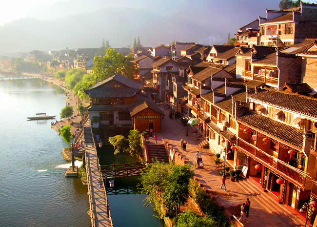 湖南鳳凰古城始建于清康熙四十三年〔1704年〕,歷經(jīng)300多年的風(fēng)雨滄桑,古貌猶存。現(xiàn)東門和北門古城樓尚在。城內(nèi)青石板街道,江邊木結(jié)構(gòu)吊腳樓,以及朝陽宮、古城博物館、楊家祠堂、沈從文故居、熊希齡故居、天王廟、大成殿、萬壽宮等建筑,無不具古城特色。古城以古街為中軸,連接無數(shù)小巷,溝通全城。古街是一條縱向隨勢成線、橫向交錯鋪砌的青石板路,自古以來便是熱鬧的集市,如今更加生機勃勃。鳳凰古城的標(biāo)志性建筑之一虹橋,原名臥虹橋,歷史悠久。鳳凰古城北門城樓本名“碧輝門”,采用紅砂條石筑砌,既有軍事防御作用,又有城市防洪功能,是古城一道堅固的屏障。鳳凰古街兩邊建筑飛檐斗拱,店鋪中陳設(shè)著琳瑯滿目的民族工藝品,濃濃的古意古韻,透出古街深厚的民族文化底蘊。