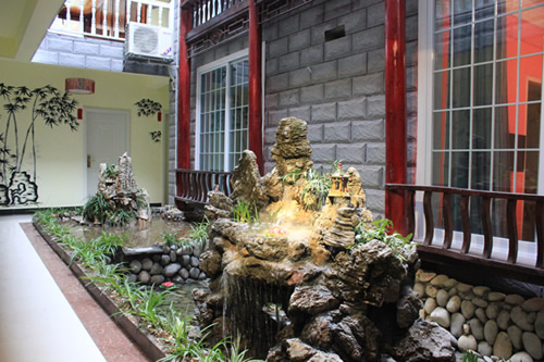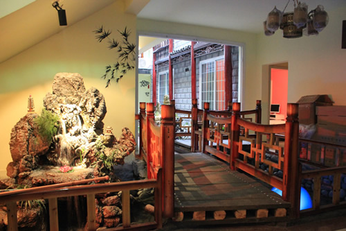 古樸的客房?jī)?nèi),超大陽臺(tái)全景落地窗,是您欣賞沱江風(fēng)光帶首選客棧,兩座百年四合院內(nèi)小橋流水,假山錦鯉,一百三十平米休閑花園別具情調(diào)。紅酒加咖啡的大堂吧、彩色精致的情調(diào)房、古典高雅的臨江觀景房以及大型公共觀景平臺(tái),龍閣的點(diǎn)點(diǎn)滴滴都透著出古城的神韻和幽靜,走進(jìn)龍閣客棧,給您一個(gè)完美的鳳凰古城沱江全景!