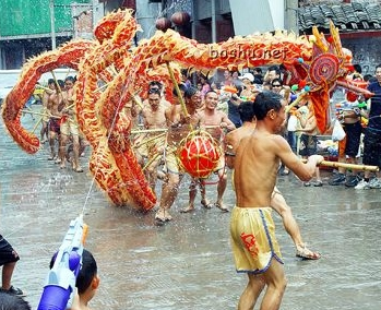 如今已發(fā)展成為對喜慶節(jié)日的慶祝,對美好生活祝福的一種方式。它用鮮棕葉作龍須,用葛藤、黃荊條、松樹枝作龍身,分9節(jié)、11節(jié)、1 3節(jié)、15節(jié)等不同長度的奇數(shù),由9至15人參加舞龍。伴著鑼、鼓、鎖吶的鏗鏘樂曲,一人持“寶”在前,龍舞歡騰時有“二龍搶寶”、“蛇蛻皮”、“烏龍絞柱”等50多種動作玩法。與此同時,身著民族服裝的群眾用臉盆、水瓢、銻桶等容器端水圍繞著龍潑澆,這樣邊舞邊潑水、水潑得越多龍舞得越歡,也預(yù)祝大家當年風調(diào)雨順,五谷豐登,其場面歡樂喜慶,風趣幽默。已列入我市第一批非物質(zhì)文化遺產(chǎn)保護名錄。