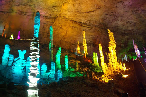黃龍洞位于索溪峪東面,被稱為“地下魔宮”,洞口霧靄迷漫,洞內(nèi)長廊蜿蜒,鐘乳懸浮,石柱石筍林立,還有石簾、石幔、石花、石琴,琳瑯滿目,異彩紛呈,令人目不暇接!岸赐舛础、“樓外樓”、“天外天”、“山外山”,盤根錯節(jié)。黃龍洞內(nèi)可分四層,水陸并進,從最低陰河至最高穹頂,垂直高度差有100多米,洞內(nèi)有一個水庫(黃龍水洞)、二條陰河(響水河、水晶河)、三個地下瀑布(黃龍瀑、天水瀑、天地瀑)、四個水潭、十三個廳(宮)(龍舞宮、水晶宮、迷人宮……)、九十六條游廊,長度約達15公里,最大的廳堂有12000平方米,可容納萬人。真可謂是洞中乾坤大,地下有洞天。入黃龍洞,如入人間仙境一般。