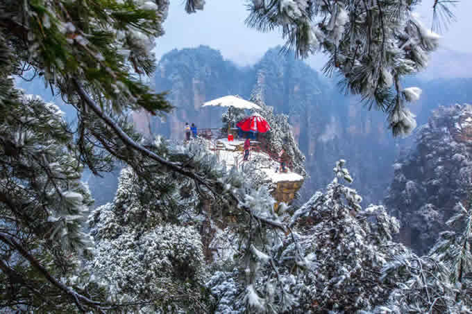 楊家界雪景 作為世界自然遺產(chǎn)武陵源四大核心景區(qū)之一的楊家界景區(qū),地勢(shì)險(xiǎn)要,風(fēng)景絕美,跟張家界、天子山、索溪峪比較,其中的地質(zhì)地貌一部分相同外,又有其獨(dú)特的資源優(yōu)勢(shì),擁有全球罕見(jiàn)的峰墻群奇光。乘坐在舒適的楊家界索道里,可以盡情體驗(yàn)“會(huì)當(dāng)凌絕頂,一覽眾山小”的居高臨下與動(dòng)感,360度暢游夢(mèng)想般的楊家界仙界,俯瞰“近在咫尺”的千山萬(wàn)壑,山舞銀蛇,千嬌百媚的絕美“峰墻”盡收眼底,無(wú)限風(fēng)光在險(xiǎn)峰,數(shù)十道氣勢(shì)如虹的石墻,一排排層巒疊嶂,相對(duì)平行而立,高矮參差不齊,宛如“天然長(zhǎng)城”,真是美輪美奐,絕景天賜,不得不讓人驚嘆大自然的璧山開(kāi)地之功。
