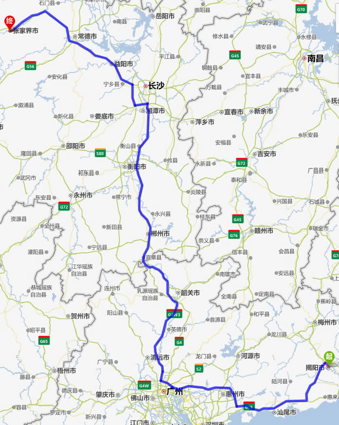 左右,沿途經過揭陽——惠州——廣州市——清遠——英德市——韶關市——樂昌市——宜章縣——郴州市——耒陽市——衡陽市——湘潭市——寧鄉(xiāng)縣——益陽市——常德市——慈利縣——張家界。