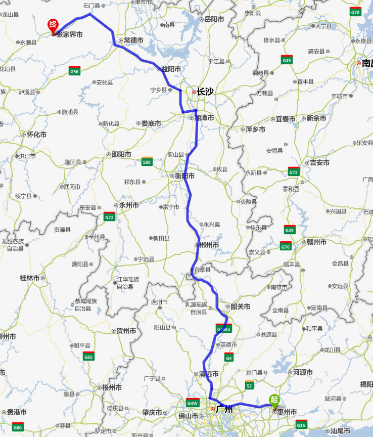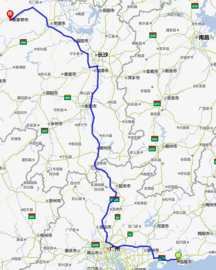 汕尾去張家界自駕車自助游線路圖全程高速):