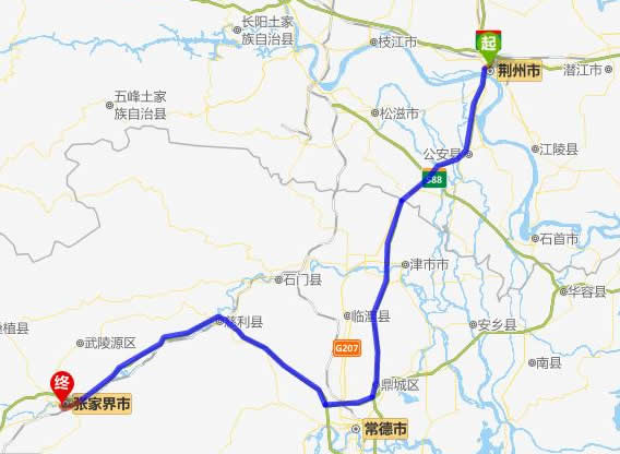 左右,沿途經過荊州市——公安縣——澧縣——常德(也可以走國道經澧縣、石門縣)——慈利——張家界。