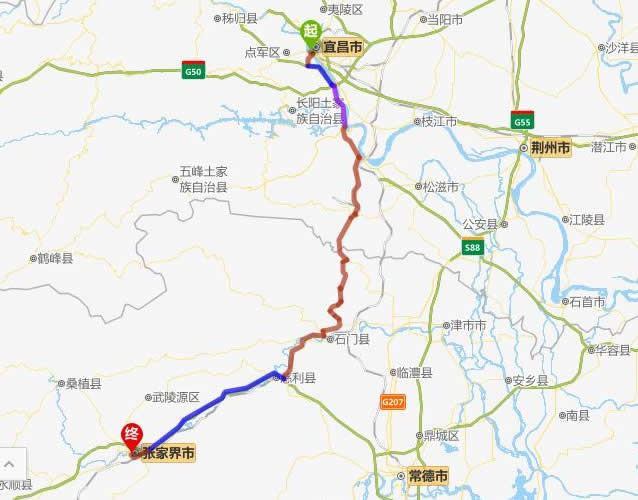 左右,沿途經過宜昌市——宜都市——松木平鎮(zhèn)——劉家場鎮(zhèn)——甘溪灘鎮(zhèn)——馬頭鋪鎮(zhèn)——皂市鎮(zhèn)——苗市鎮(zhèn)——慈利縣——張家界。